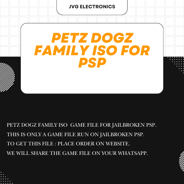 *Petz Dogz Family* for the PlayStation Portable (PSP) is a pet simulation game where players can adopt, raise, and care for virtual puppies. In the game, you choose a dog from different breeds, each with its own unique traits and personality. You are responsible for feeding, grooming, training, and playing with your pet to keep it happy and healthy. The game offers a variety of activities and mini-games to keep you engaged with your new furry friend. You can also interact with other pet owners and their dogs in the virtual world. As you progress, you can unlock new items and accessories to customize your dog's appearance and home. This is a ISO game file for PlayStation portable which will run through memory card in all PSP models only. We will share file on your WhatsApp number after placing order. This is not a CD