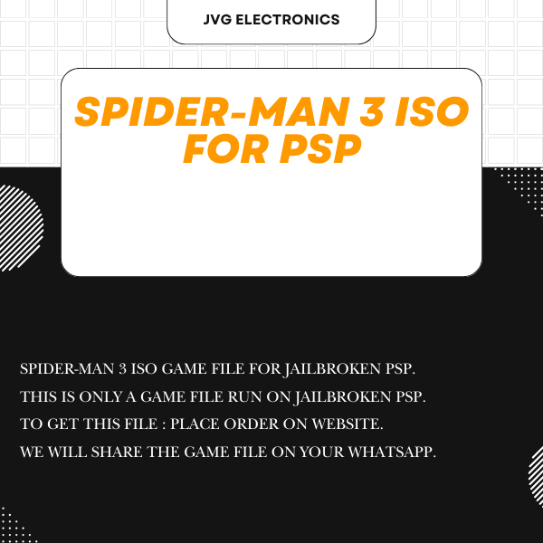 "Spider-Man 3" on PSP is an action-adventure game based on the movie of the same name. Players step into the role of Spider-Man as he swings through the city, fighting crime and taking on a variety of villains. The game features an open-world environment where players can freely explore the city, complete various missions, and engage in battles with enemies. Spider-Man can utilize his iconic web-slinging abilities, wall-crawling, and combat skills to defeat foes and save the day. The game also includes story missions that follow the events of the film, as well as side missions and challenges for additional gameplay. This is a ISO game file for PlayStation portable which will run through memory card in all PSP models only. We will share file on your WhatsApp number after placing order. This is not a CD