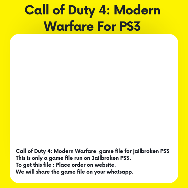 "Call of Duty 4: Modern Warfare" for the PlayStation 3 (PS3) is a groundbreaking first-person shooter that takes players on an intense journey through modern combat. Set in a contemporary world torn by conflict, it offers thrilling single-player missions and adrenaline-pumping multiplayer battles. With its gripping storyline, immersive gameplay, and cutting-edge graphics, "Call of Duty 4: Modern Warfare" delivers an unforgettable gaming experience. This is only a game file which will run on jailbroken PS3 slim / fat / super slim After placing order we will share the file link on your WhatsApp number This is not a CD