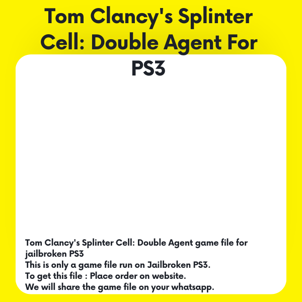 In "Tom Clancy's Splinter Cell: Double Agent" for the PS3, players take on the role of Sam Fisher, an elite agent tasked with infiltrating terrorist organizations. In this installment, Fisher goes deep undercover within a dangerous terrorist group, facing moral dilemmas and intense action as he balances his loyalty to his country with the demands of his mission. The game features stealth-based gameplay, advanced gadgets, and a gripping narrative filled with twists and turns. This is only a game file which will run on jailbroken PS3 slim / fat / super slim After placing order we will share the file link on your WhatsApp number This is not a CD Join our telegram for free gaming files https://t.me/+MRu5umI_o7lkYmU1 Subscribe us on youtube for more videos http://www.youtube.com/@JVGELECTRONICS1 Follow us on Instagram https://www.instagram.com/jvg.electronics?igsh=dDI4YzhlcG9kMnM5